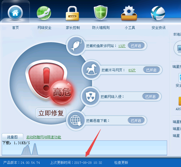 以下面截图为例,这是2017-7-27的瑞星个人防火墙,现在升下级: