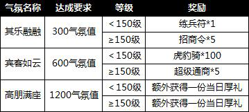 活动内容:活动期间,玩家通过送发请帖宴请群雄,可获得相应奖励。同时邀请到品质相同的三位武将时,可增加气氛值。当气氛值达到指定值时,可获得额外奖励。