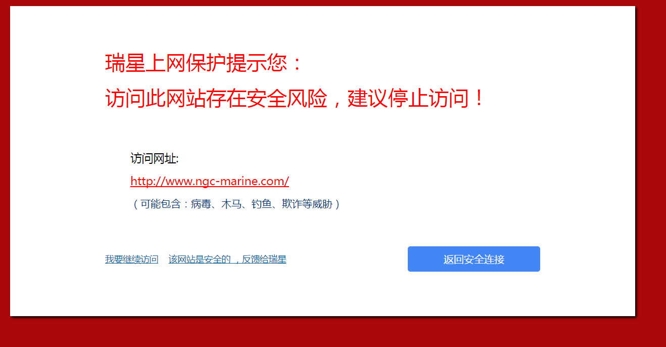 www.ngc-marine.com被瑞星防火墙拦截。该域名之前多出一条二级域名被指向不良网站,半个多月前已清理,瑞星卡卡不良网站申诉多次无果,400电话始终拨打不通,请尽快帮忙予以解除屏蔽,谢谢!
