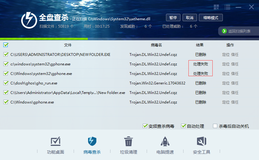 2、全盘杀毒时,有处理失败现象!