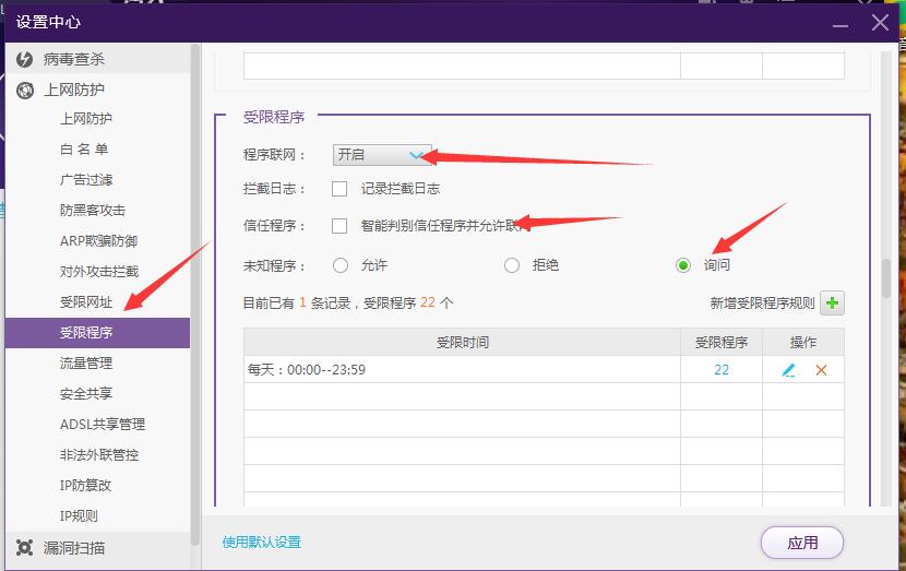2:进入设置中心——上网防护——受限程序