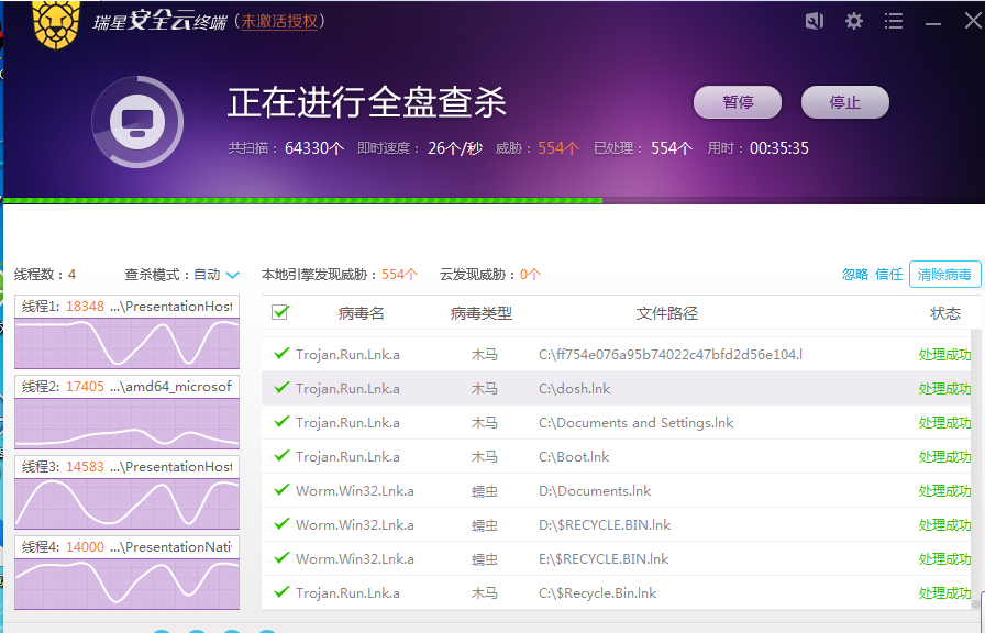 已经扫描了6万多个文件了, 病毒已经发现了 5百多个了; 时间是35分钟