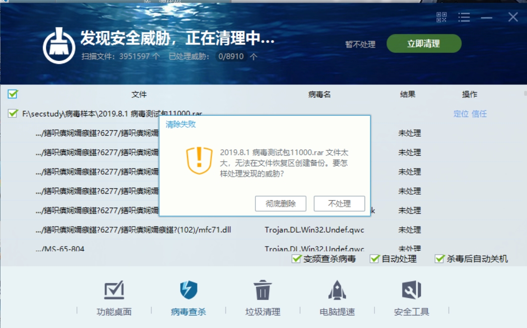 对于大压缩包如果点了自动关机,希望定时30s,默认不处理,下次开机时弹个像右键扫描出病毒弹出的那种大窗口提示处理。