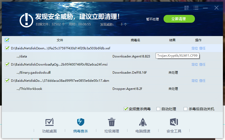 你再多扫几次, 我这里 扫描并处理完毕后 ,多次扫描 还是会发现病毒存在