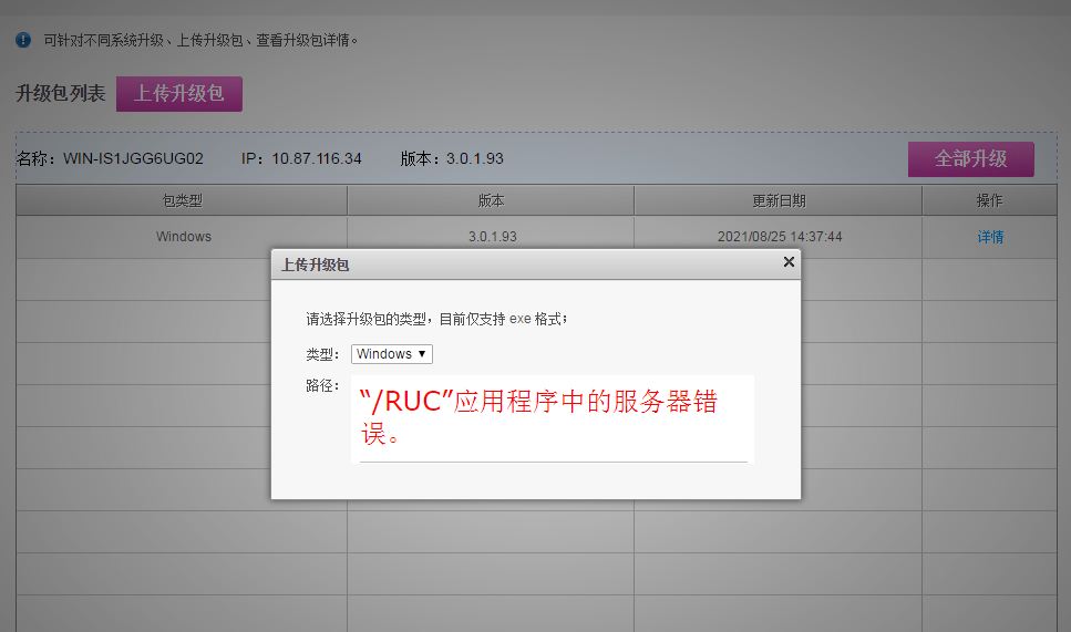 如题,服务端的C盘空间只剩700多M,上传更新包后出现下图提示。