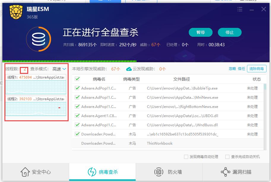 看esm365 才两个线程,还不如云终端线程多,希望瑞星能增加扫描线程,用于提升扫描速度