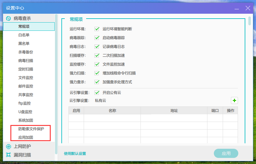 反馈BUG:设置页面,想要点击左侧的“应用加固”,但一定会跳转到“勒索文件保护”,只有在“勒索文件保护”下点击“应用加固”,才能正常跳转提交建议: