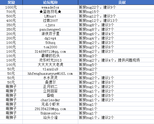 按照活动期间发掘bug的数量和优先级,恭喜以下朋友获奖: