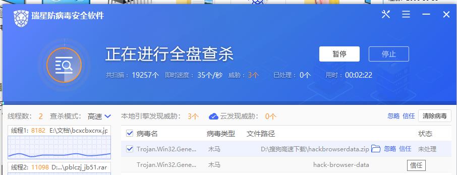 操作系统及补丁情况:WIN10 21H2(操作系统内部版本 19044.1889)浏览器及版本:搜狗浏览器 11.0.1.34700(已去除搜狗保护)瑞星软件版本:3.0 BUILD 50.24涉及的其他软件及版本:WIN10问题现象:全盘查杀找到病毒之后,点[忽略][信任]没反应