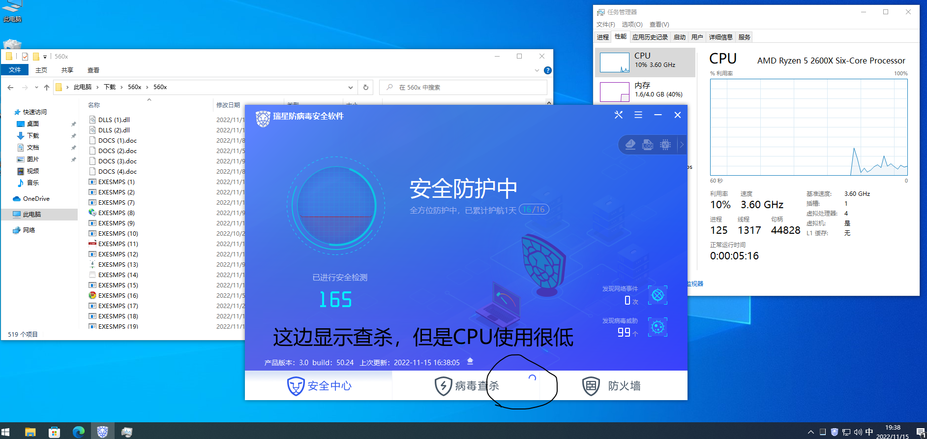1,在扫描查杀期间,点击跳出查杀页面,就再也进不了当时查杀页面了。查看任务管理CPU降低,个人感觉可能降低优先级,后台扫描了吧。