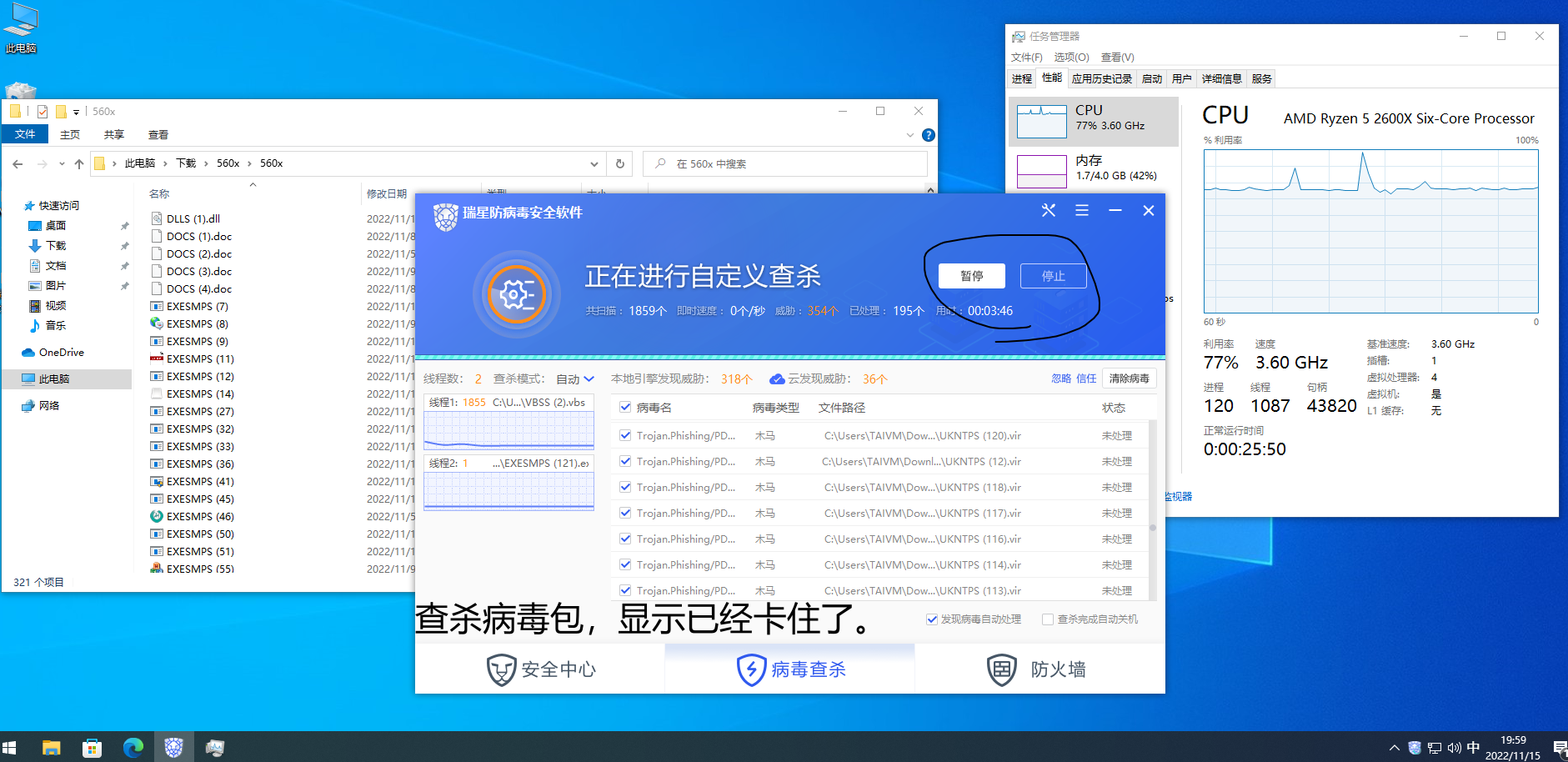2,查杀大包卡住了。几十分钟过去了还是卡住的页面,但是CPU居高不下。