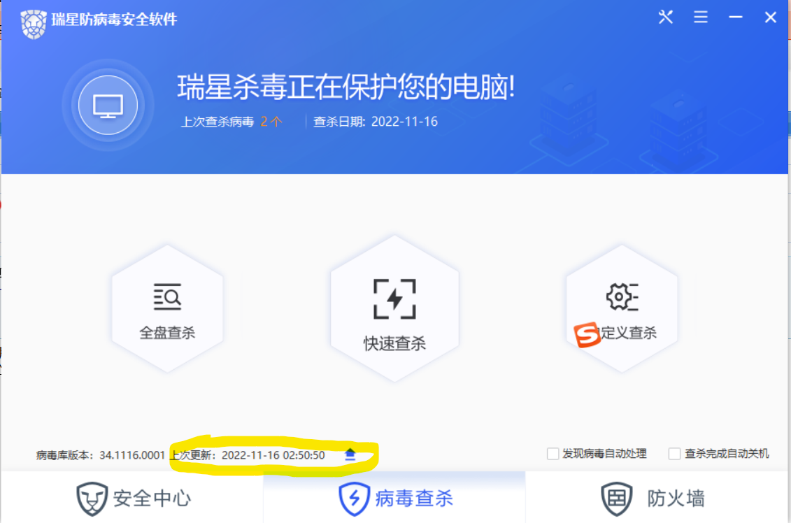 在安全中心点更新之后,你再点病毒查杀那个页面,你会发现更新时间不一致。