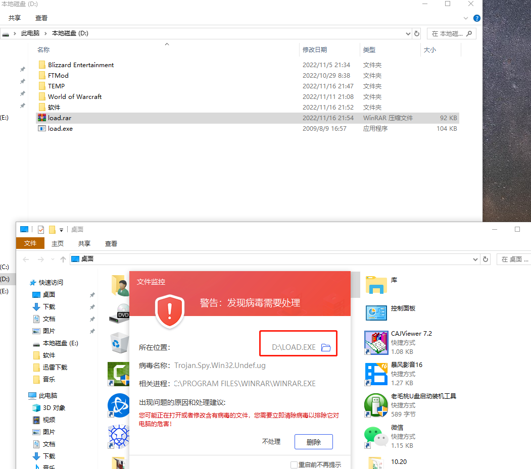 将病毒下载在D盘(其他位置也是一样),解压后文件监控提示发现病毒,但点击打开文件位置的按钮,每次打开的都是桌面。