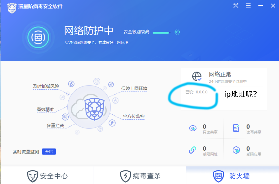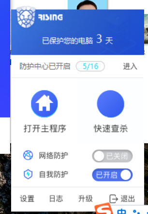 如图:假如,占时不需要防护了,需要临时关闭所有防护。网络防护已关闭,但系统防护还在运行,需要快捷关闭所有防护。不要退出,太麻烦!