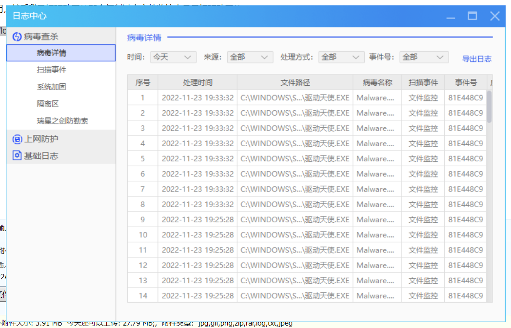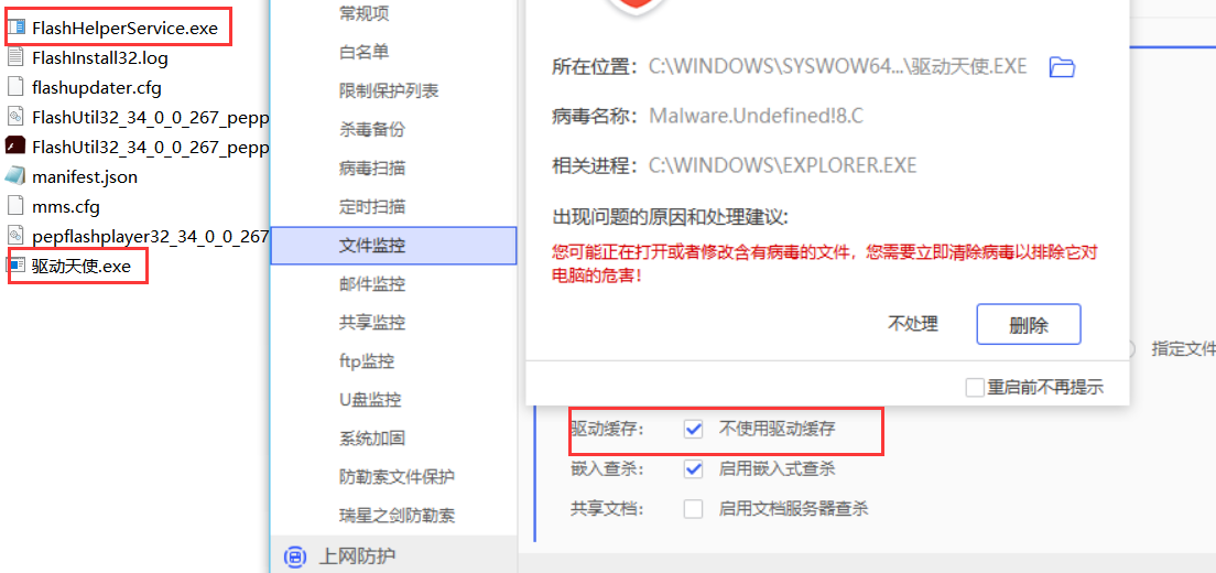 我这里驱动天使文件监控疯狂弹窗,文件扫描就是不报啊,来个扫描和文件监控的合影。。。。。