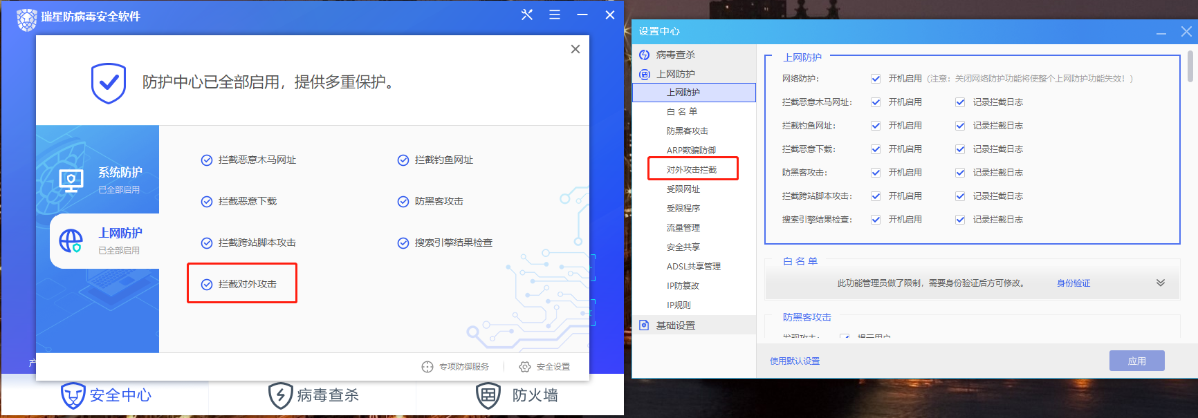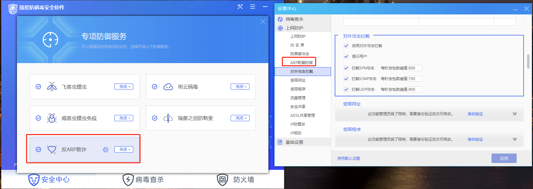 1. 防护中心 写的是 拦截对外攻击,而 设置中心 写的是 对外攻击拦截,名称不一致。而且,防护中心,点击设置,定位的却是 上网防护。现在防护中心14项,只有 对外攻击拦截定位错误,其余都好了。2. 专项防御 反ARP欺诈,定位的却是 对外攻击拦截,名称也不一致。