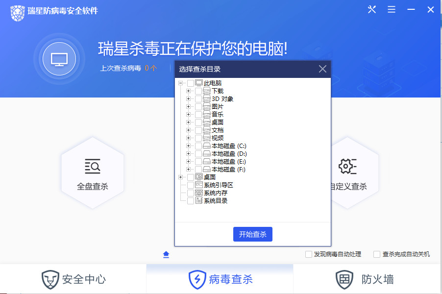系统托盘退出后,点击桌面图标重启安全软件。进入病毒查杀界面