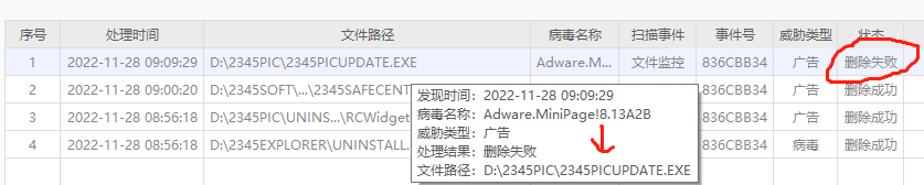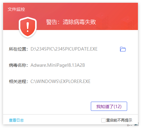 今天疑似2345看图王被报毒(报广告),虽然2345被报很正常,但是吧你说要是真病毒也是这样弹出清除失败但又没下一步的推荐操作是不是会给普通业主带来困扰?希望瑞星工程师这边能把电脑小白用户也考虑进去,不然像我老爸老妈那种电脑小白就除了产生困扰知道电脑有病毒就不知道下一步该怎么做了,杀毒软件是帮用户解决问题的而不是把问题抛给用户自己去思考对吧?