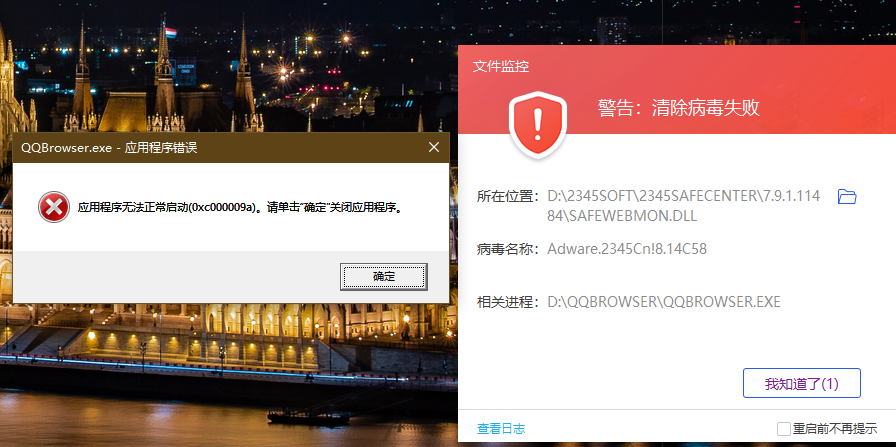 安装公测版的瑞星防病毒软件后QQ浏览器打开后被报毒,之后就报错再也无法打开。