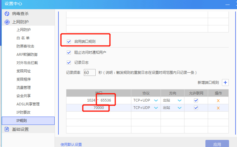 3.设置中心--上网防护--IP规则--启用端口规则,输入无效端口,可以保存,未提示错误。