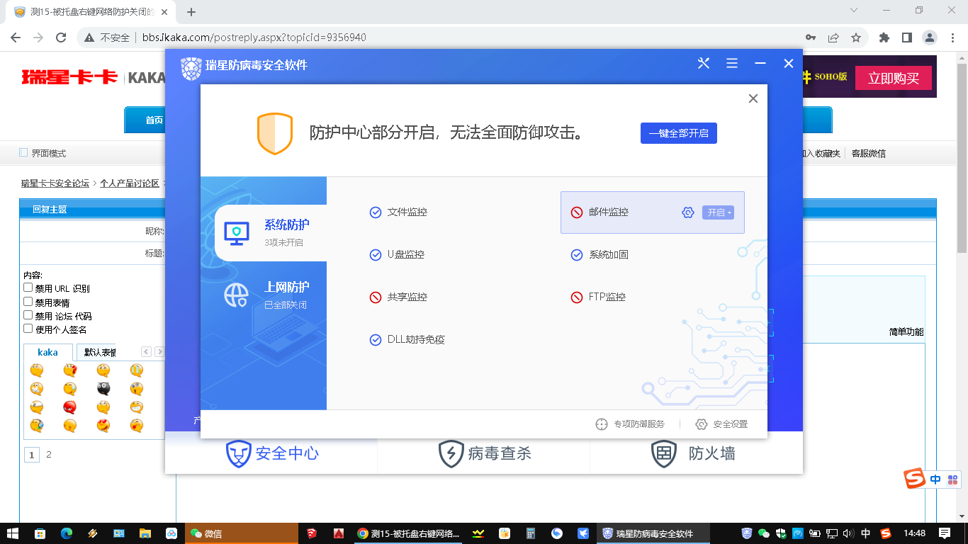 首页 » 个人产品讨论区 » 瑞星防病毒安全软件 » 测15-被托盘右键网络防护关闭的选项无法通过主程序一键开启功能打开
