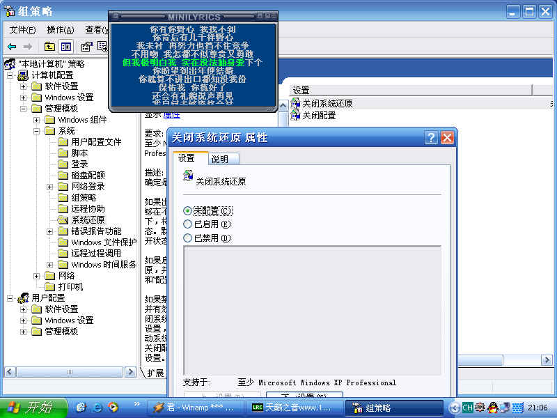 其实很简单,,首先在服务里开启"System Restore Service",,,,,,,,,然后到组策略里的系统还原里把"关闭系统还原",,设置成"未配制"就可以了..我就是这样关闭系统还原的,,从而达到就算在服务里开启System Restore Service服务也用不了系统还原,,,因为系统还原"烂"就一个字,我只说一次...