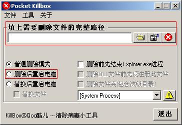 在“填上要删除的病毒完整路径”栏目里填入"c:\windows\system32\seeleomf.d1l"同时勾选“删除后重启电脑”(见下图红框)