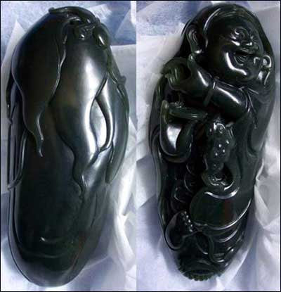 青玉和青白玉:色呈深灰绿至蓝绿色,不透明;青白玉是青玉与白玉之间的过渡类型,呈灰绿色。
