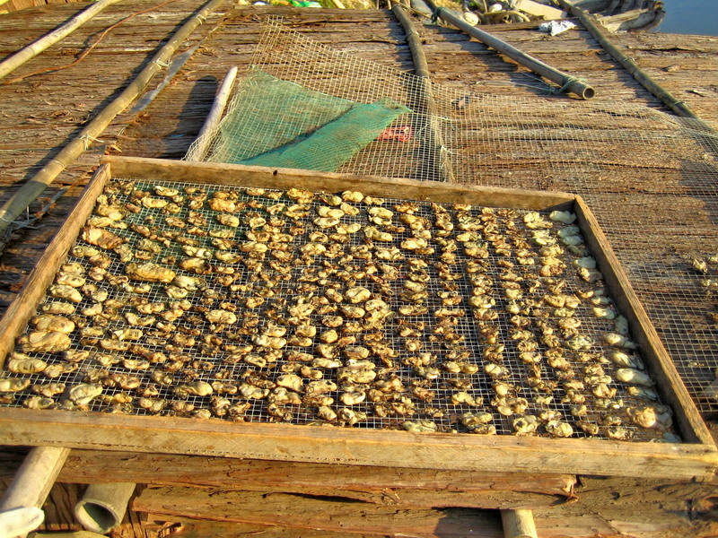 工人们正把生蚝撬开。旁边那黑乎乎的就是生蚝了。