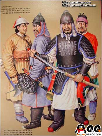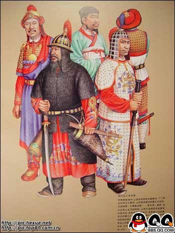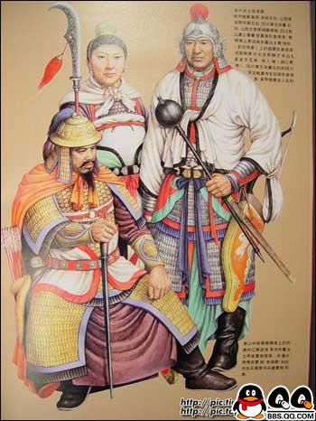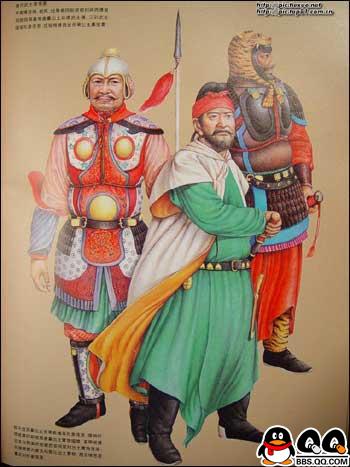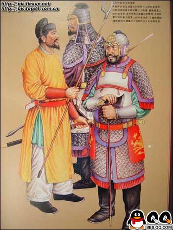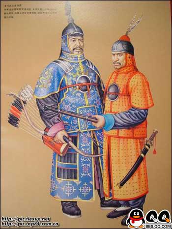 11、图为唐代穿明光甲及戎服的武士复原图。初唐的铠甲和戎服的基本保持着南北朝以来至隋代的样式和形制。贞观以后,进行了一系列服饰制度的改革,渐渐形成了具有唐代风格的军戎服饰。高宗、则天两朝,国力鼎盛,天下承平,上层集团奢侈之风日趋严重,戎服和铠甲的大部分脱离了使用的功能,演变成为美观豪华,以装饰为主的礼仪服饰。“安史之乱”后,重有恢复到金戈铁马时代的那种利于作战的实用状态,特别是铠甲,晚唐时已形成基本固定的形制,唐代的铠甲,据《唐六典》记载,有明光、光要、细鳞、山文、鸟锤、白布、皂娟、布背、步兵、皮甲、木甲、锁子、马甲等十三种。其中明光、光要、锁子、山文、鸟锤、细鳞甲是铁甲,后三种是以铠甲甲片的式样来命名的。皮甲、木甲、白布、皂娟、布背,则是以制造材料命名。在铠甲中,仍以明光甲使用最普遍
