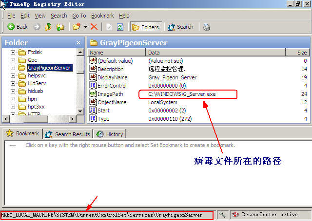 给你举的那个例子,要删除的——是左面栏目中的GrayPigeonServer。这个GrayPigeonServer就叫做“包含C:\windows\G_server.exe的服务项”。它是灰鸽子建立的。