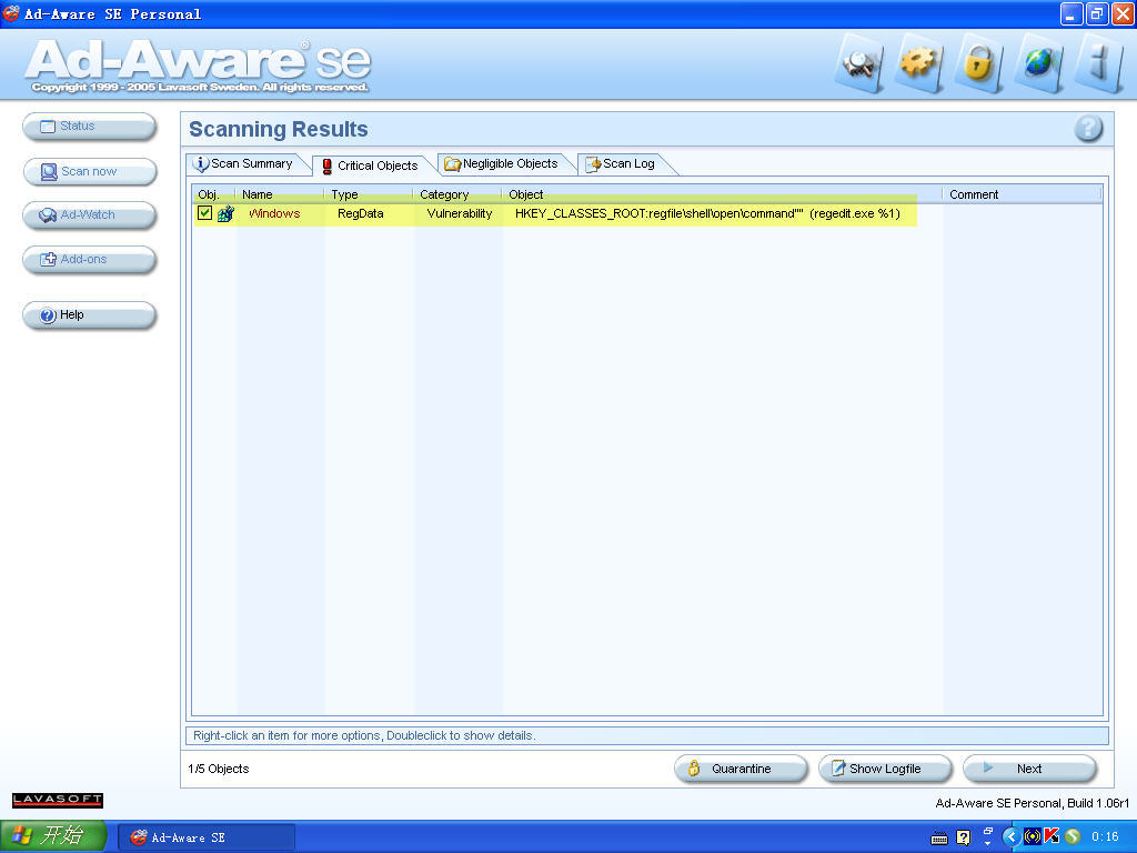 我使用Ad-Aware SE Personal扫描的结果