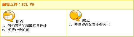 功能方面,内置的MP3播放器是V9的另一大卖点,官方资料显示其采用TCL独有的“激扬”音频处理器,而从实际试听来看,音质尚属中等水平,表现不过不失。此外,对于TF卡的支持也让V9的用户可以尽情的享受影音娱乐带来的乐趣。