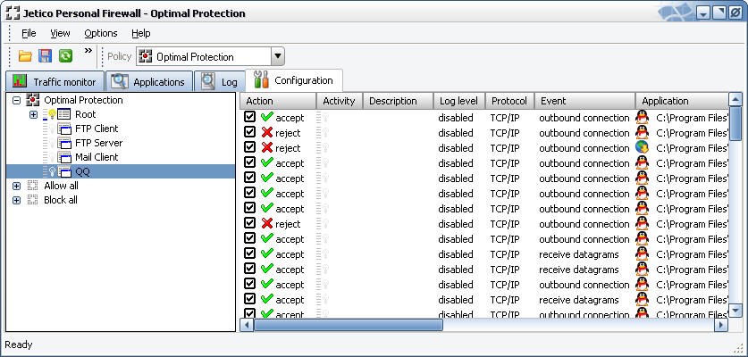 而且Jetico的规则移动起来很方便,直接拖动就可以了,而且支持多选,所以原来的规则很容易就拖动到新的QQ table里了,呵呵……