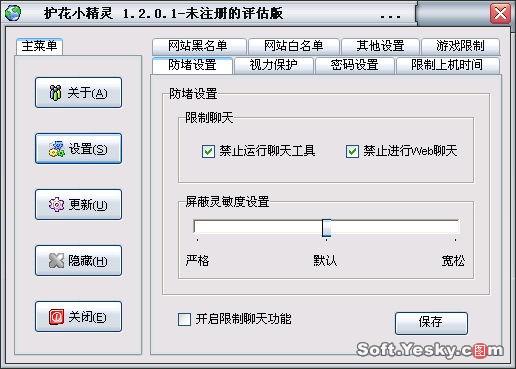 (2)控制网上聊天。可以根据您的设定,禁止所有目前流行的聊天软件的运行,并可以限制未成年人进入运行于IE浏览器中的网页形式的聊天室中聊天。