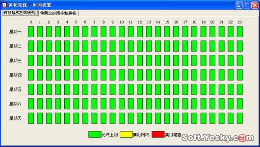 (3)家长无忧  该软件这方面的功能更强(如图10),可以任意设置某个小时能访问网络,或不能访问网络,或不能使用电脑。对电脑和上网有全面的控制功能,非常完美!