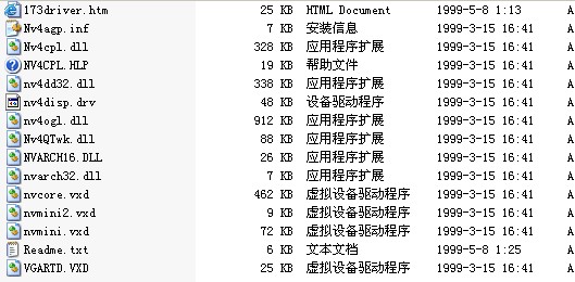 在网上找也没找到有setup命令可以安装驱动形式的显卡驱动程序,下载的显卡驱动程序解压后都是零散的文件,扩展名大都是.dll、.vxd 、.inf之类的文件(如图)