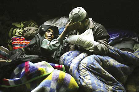 美国《时代》周刊记者柏拉·布洛恩斯坦所拍摄的《克什米尔地震的难民》赢得年度最佳新闻照片奖。图为2005年10月17日,一位母亲在轻轻的摸着她受伤的儿子的头.他们住在Balakot一个废弃的城镇的帐篷中。