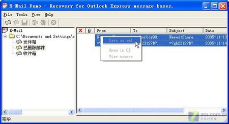 接下来,该软件会侦测出你当前OE中邮件的保存文件夹,同时会出现如图1所示界面。首先回忆并选中误删除的邮箱,然后选择“Tools”(工具)→“Message base recovery”(仅恢复误删邮件),单击相应邮件,即可看到其内容,也包括从谁发来,发更新给谁,主题及附件等(如图14)。如果要恢复该邮件,只要右击它,选择Save as eml命令即可把它保存为eml格式的邮件(仅限于注册版本)。然后把它直接拖放到OE的邮箱中即可恢复。