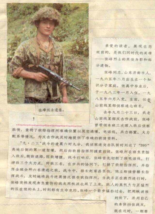 张峰同志,山东济南市人,一九六五年二月出生在一个知识分子家庭。他高中毕业后,于一九八三年一月入伍。一九八五年六月入党。生前,任老山前线某部侦察连七班长。