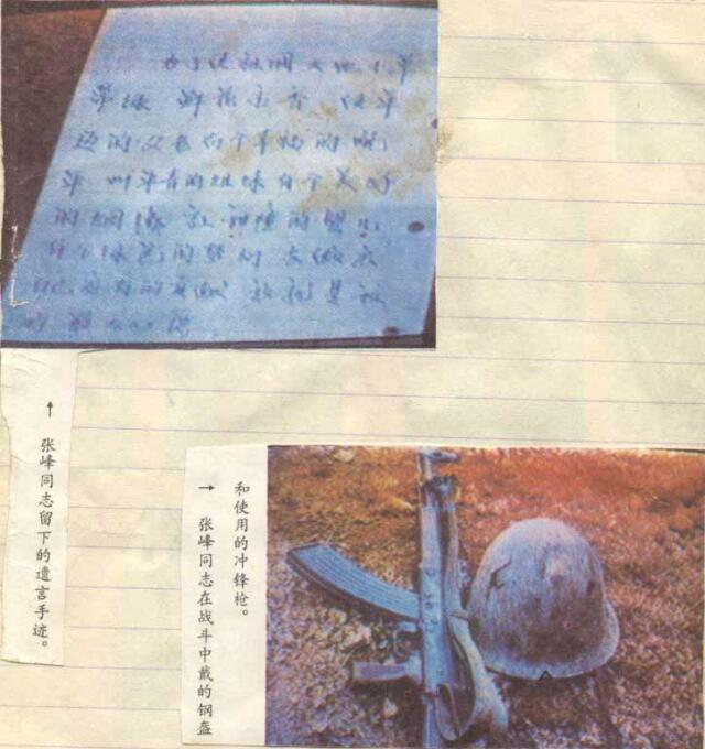 去年九月二十三日,我老山前线某部反击作战前,张峰曾带领本班三次深入敌后侦察敌情,查明了敌排指挥所准确位置以及交通壕、电话线、兵力部置、火力配系等情况,为反击作战及时地提供了准确的敌情资料。