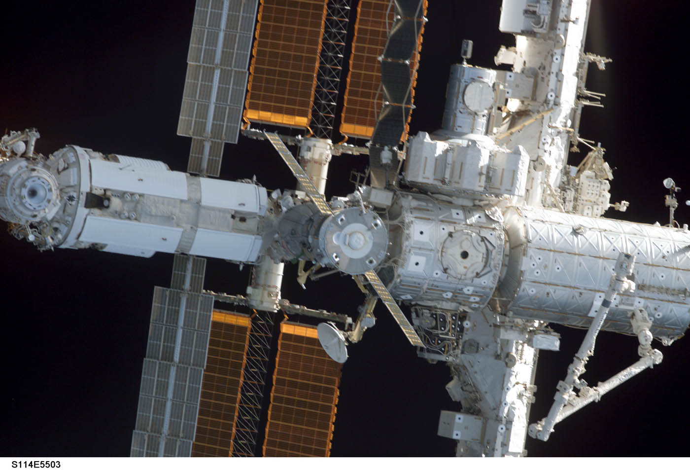 2005年8月5日,与国际空间站即将分离的发现号,照片由第11考察组的宇航员拍摄。最近处是与空间站连接在一起的俄罗斯“曙光”号太空舱,上方是空间机械手,最后是处于对接状态的发现号。
