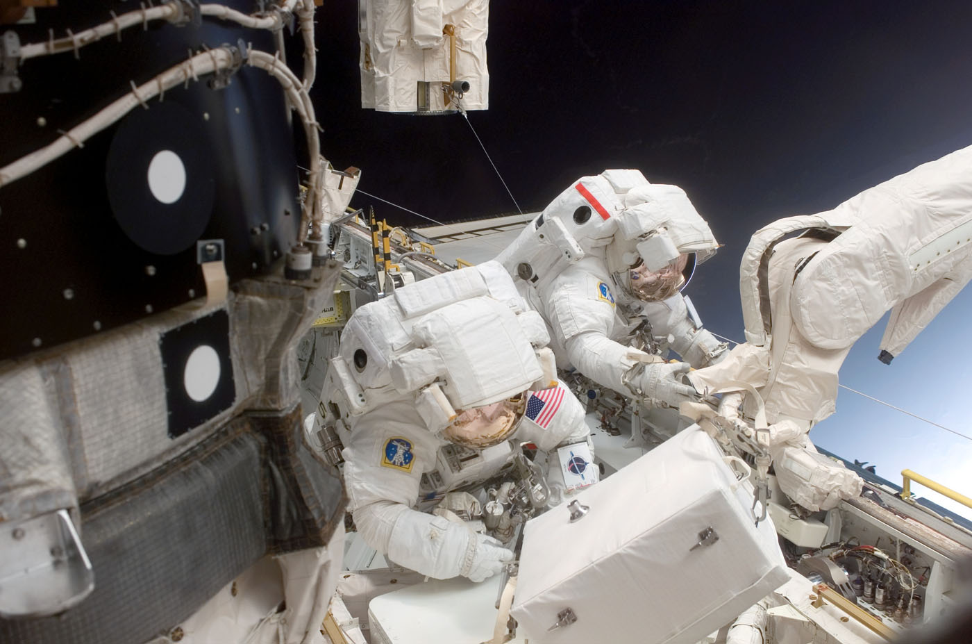 2005年7月31日,斯蒂芬·K·罗宾森与野口聪一在发现号货物舱进行作业。