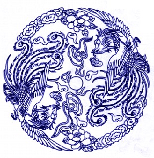 璞注:「鸡头、蛇颈、燕颔、龟背、鱼尾、五彩色,高六尺许。」「出于东方君子之国,翱翔四海之外,过昆伦,饮砥柱,濯羽弱水,莫宿风穴,见则天下安宁。」古来有关凤凰的传说故事很多,传统年画,以凤凰为题材的图案运用也较普遍.