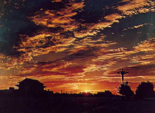 《东方红》摄于1961年8月。一个清晨听到广播电台播放的《东方红》乐曲,我突然受到启发,将“日出”和“天安门”两个本来毫不相关的意象联系在一起,头脑中产生了“一轮红日在天安门的东方透过瑰丽的彩霞冉冉升起”这样一个完整的艺术意象。遂以比喻和象征的艺术语言,运用摄影艺术手段,将这一头脑里的艺术意象,表现在摄影画面上,成为凝固的艺术形象。命题《东方红》,歌颂我们年轻的人民共和国以及共和国缔造者。同时也祝愿祖国在当时经历了三年困难后的复苏,以及光辉的前程。