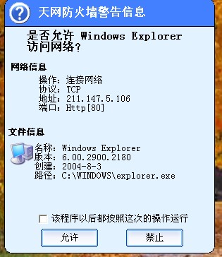 点击桌面我的文档、我的电脑、网上邻居都会出现一个天网防火墙的页面,不明白是什么意思,我都是点击禁止的,页面如下: