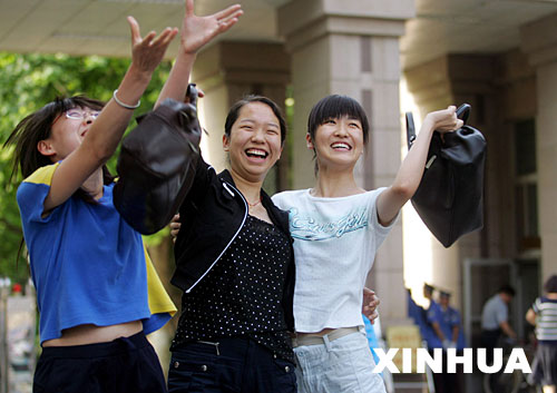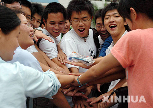 月8日,济南一中考场外,结束高考的考生兴奋异常。截至当日17时,除上海、广东和江苏三省市外,2006年全国普通高等学校统一招生考试降下帷幕。新华社记者摄