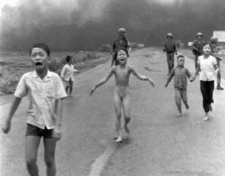 一幅促使越战提早半年结束的照片——火从天降,被燃烧弹烧着的女孩惊恐万状地逃命,她的身边是一群无动于衷的美国大兵