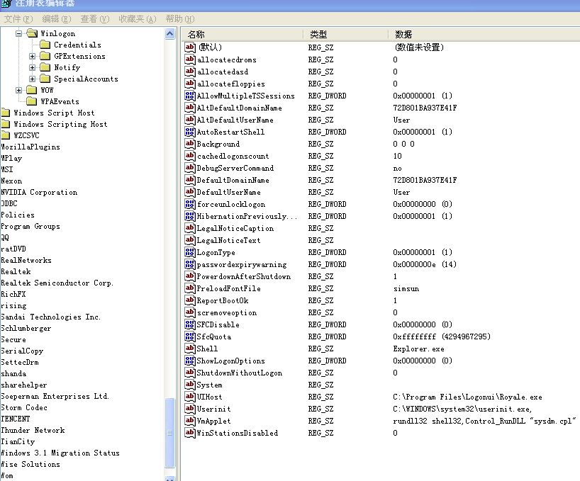 请将注册表中上面那个路径下面的“Winlogon”键值右面的东西导出来我看看一下,