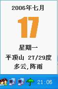 www.88dog.com这个软件的功能为把鼠标放在桌面右下角显示时间的位置上可以显示出日期,星期几,天气预报,农历.比较不错,推荐一下~演示图片请看www.88dog.com或者参看一下图片~